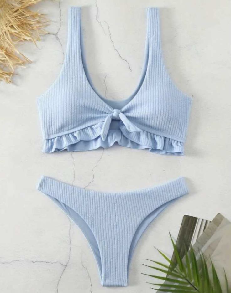 Bikini celeste con volados marca Shein nueva. Vedetina con nudo.