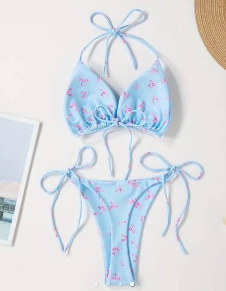 Bikini Shein nuevo celeste con flores rosas. Corpiño básico triangulo y colaless.