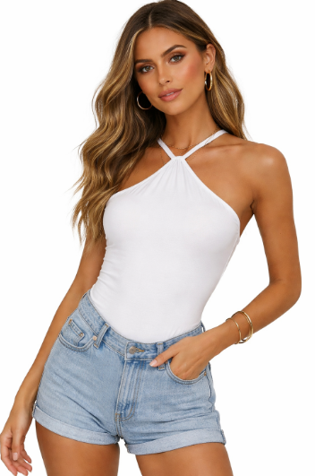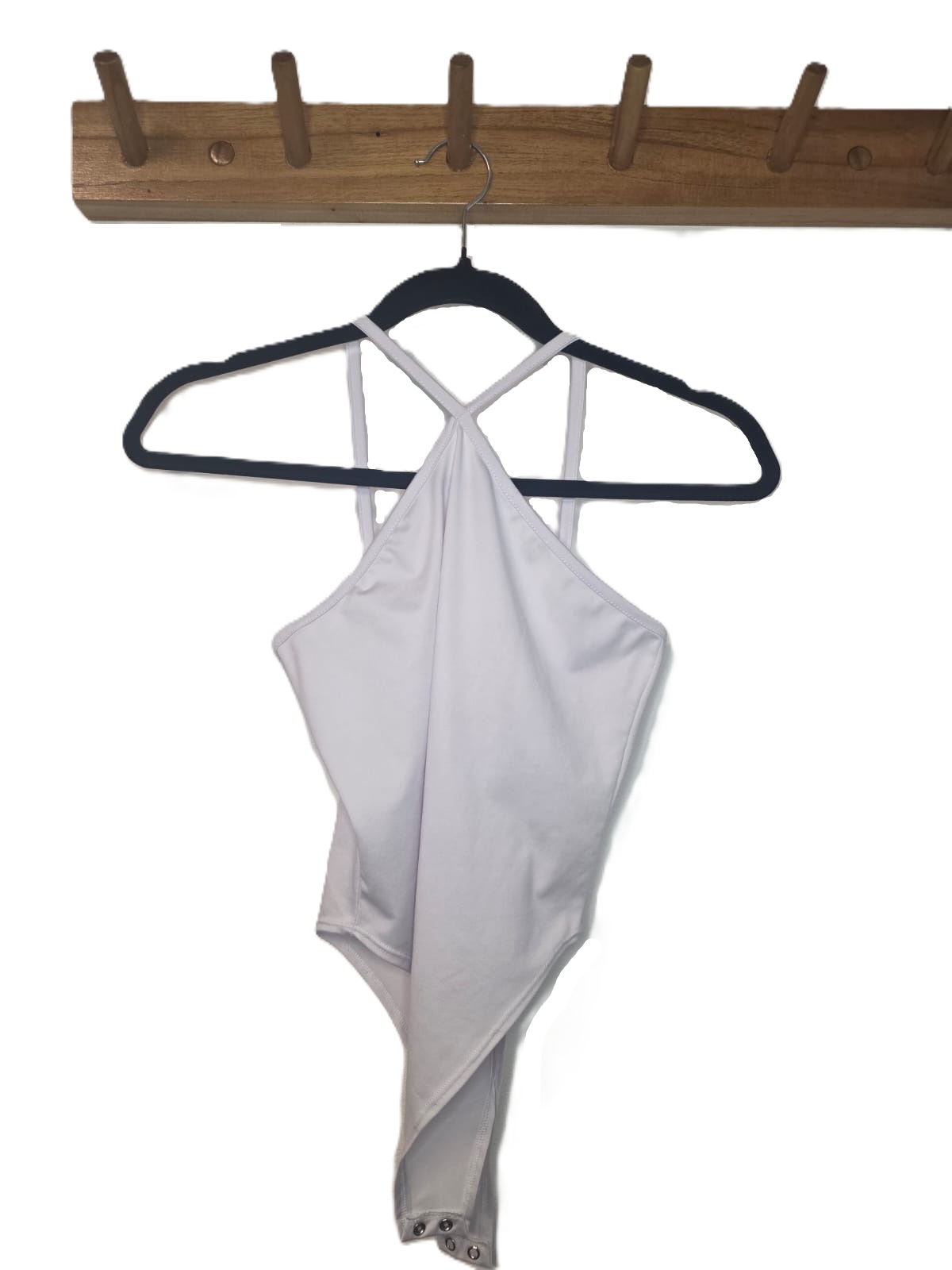 Body blanco de tela elástica, con diseño halter de tirantes finos cruzados en el cuello. Como nuevo.
