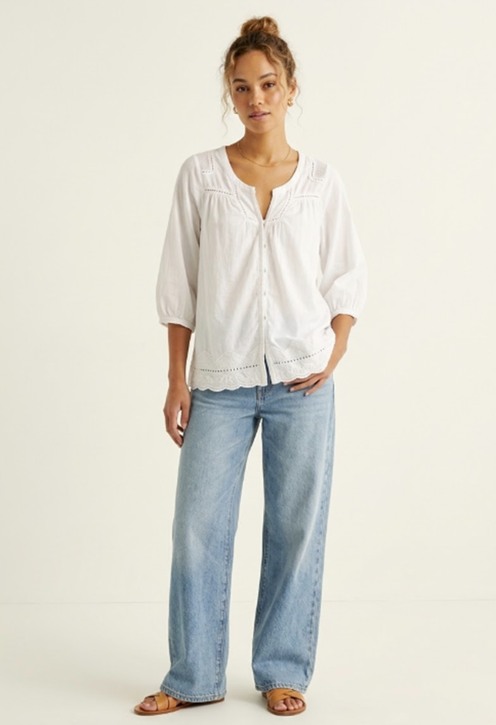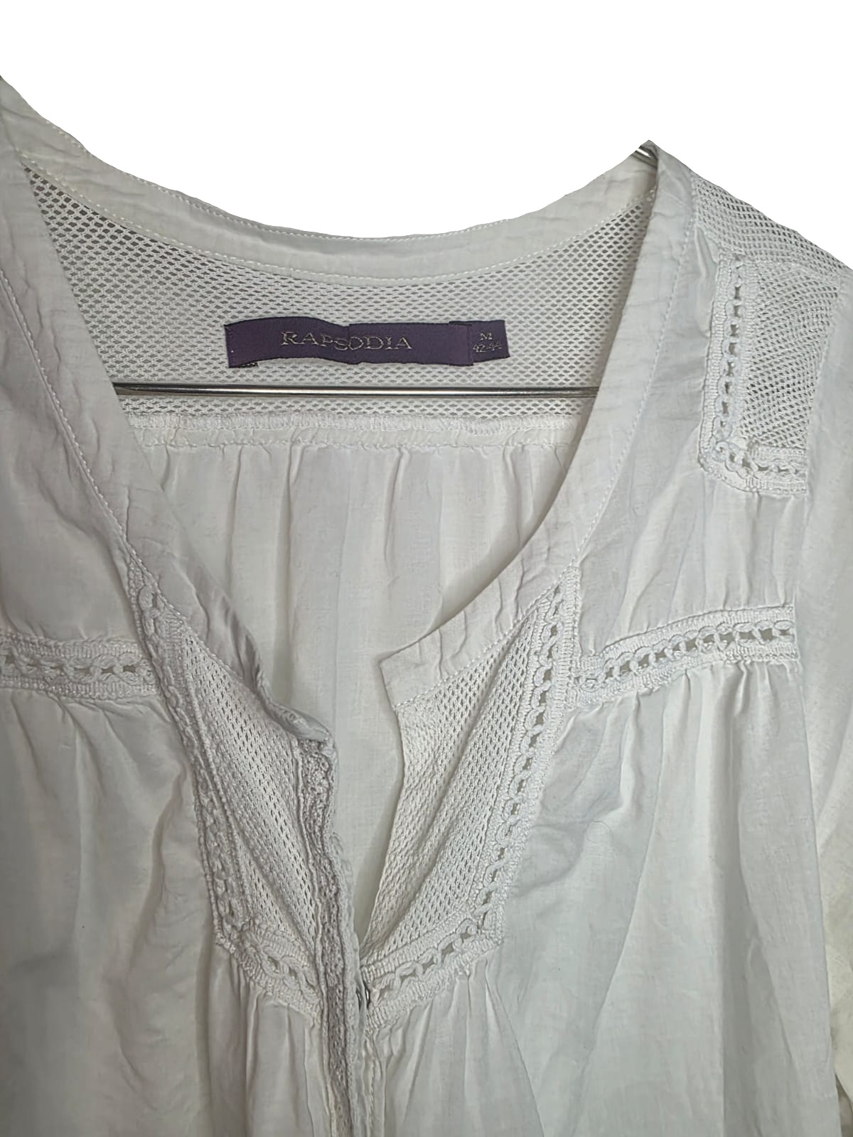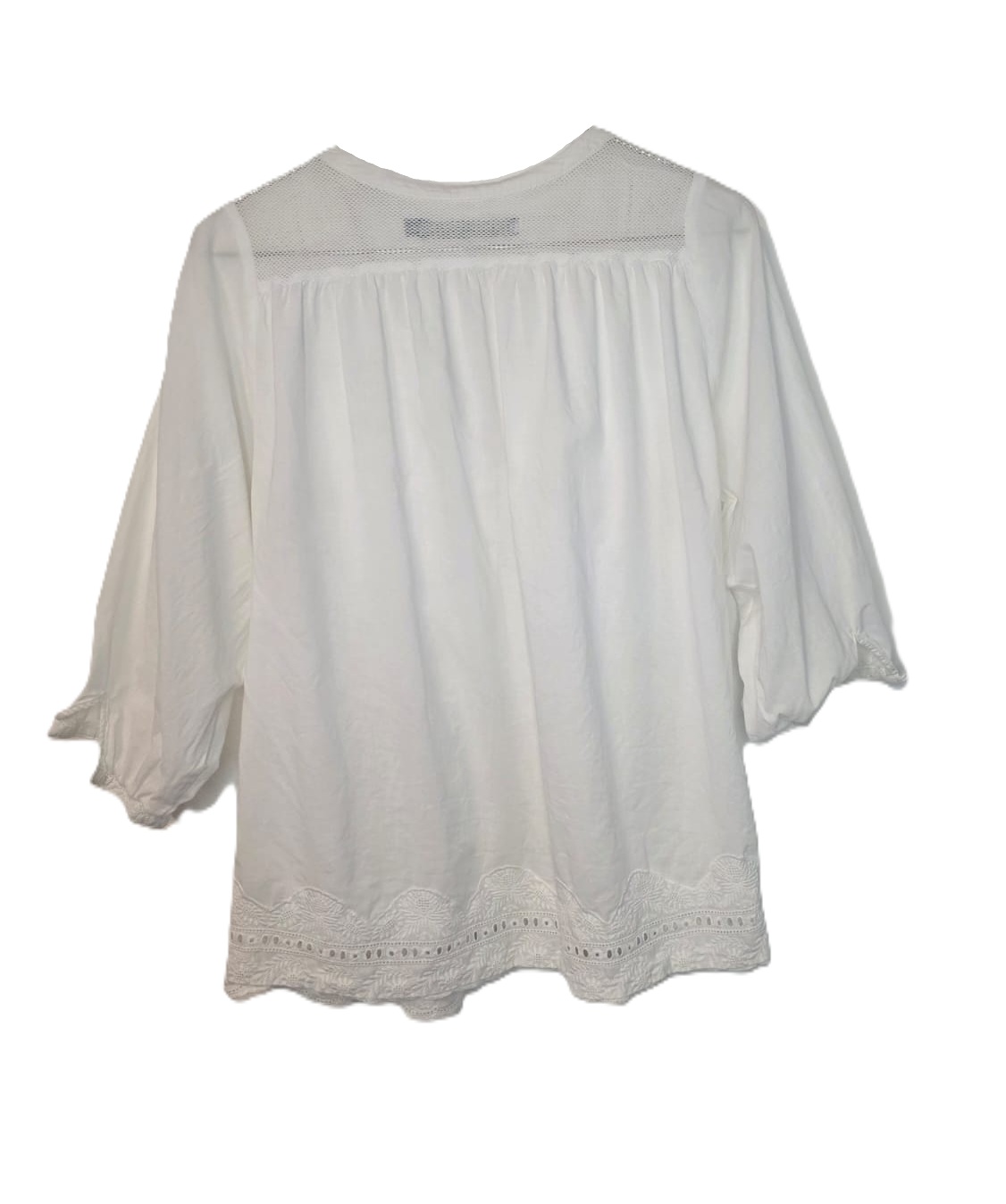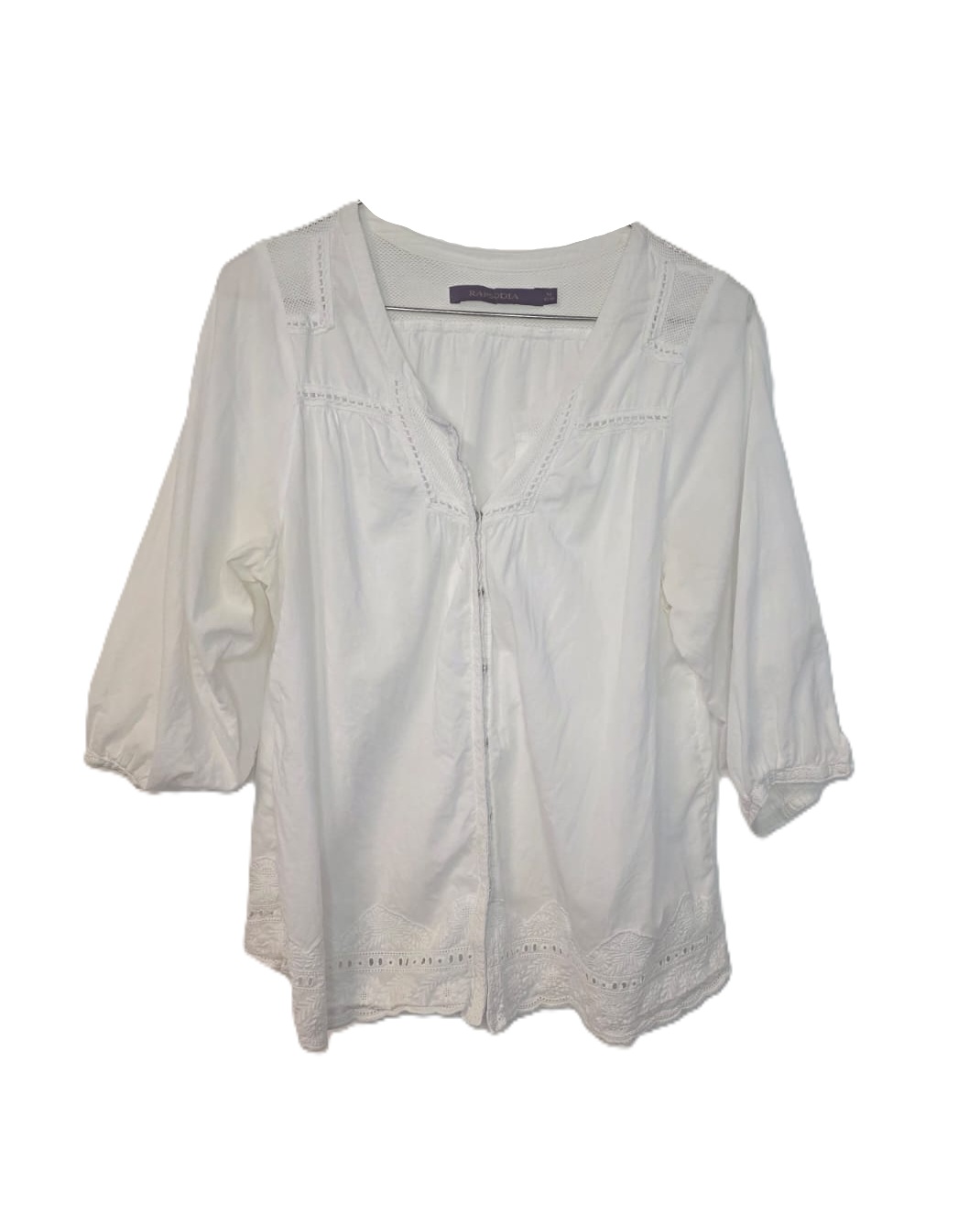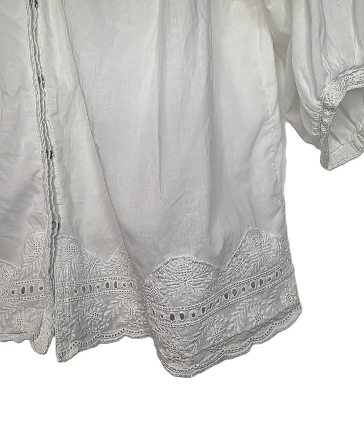 Blusa blanca marca Rapsodia como nueva, de inspiración romántica confeccionada en algodón liviano, que destaca por su delicado bordado y mangas estilo abullonado que aportan un volumen suave y femenino.