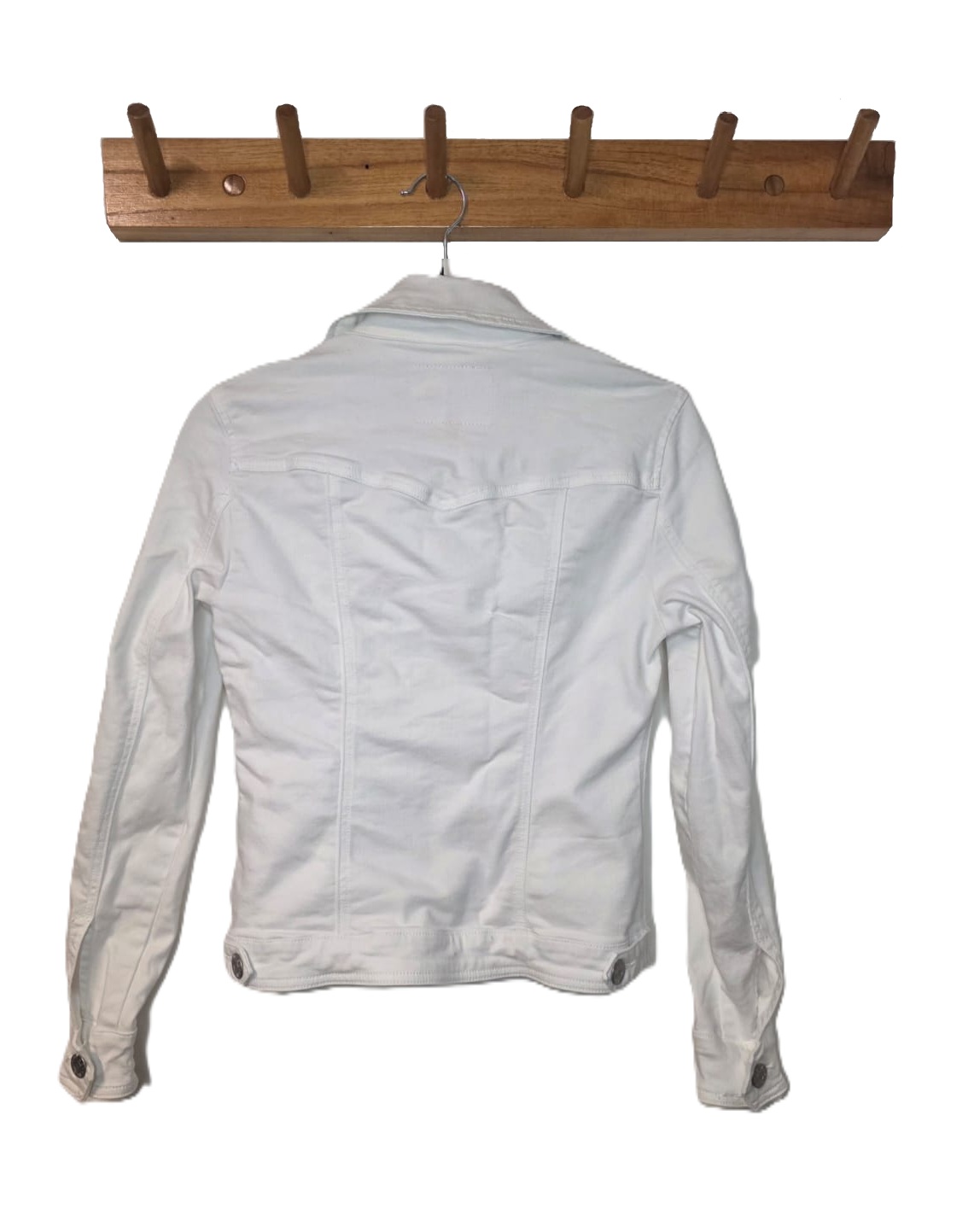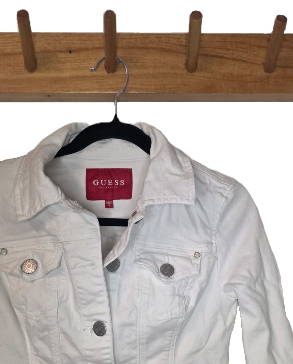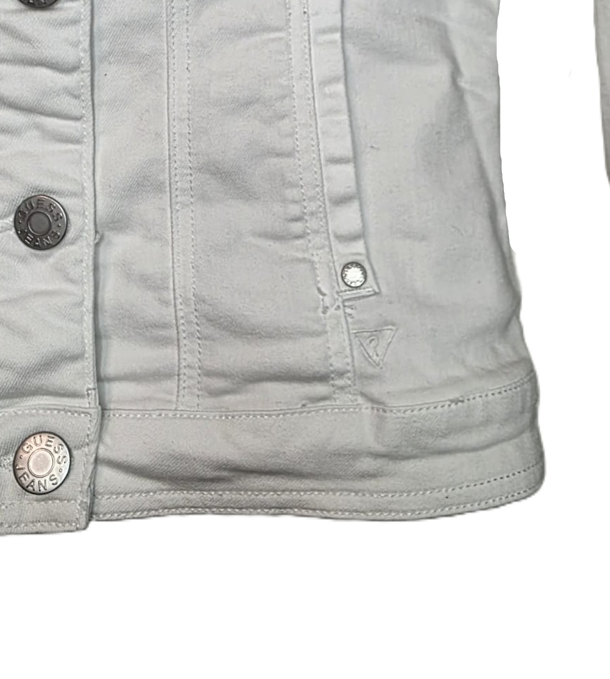 Campera de jean blanca Guess, entallada y clásica, con botones metálicos y bolsillos frontales, ideal para un look moderno y versátil.