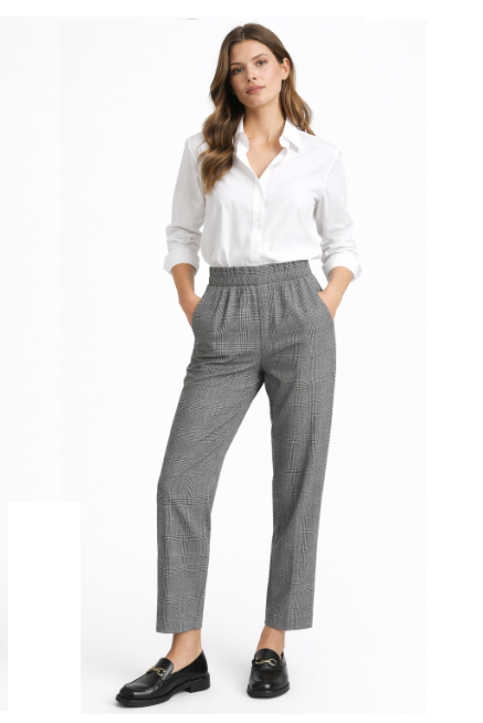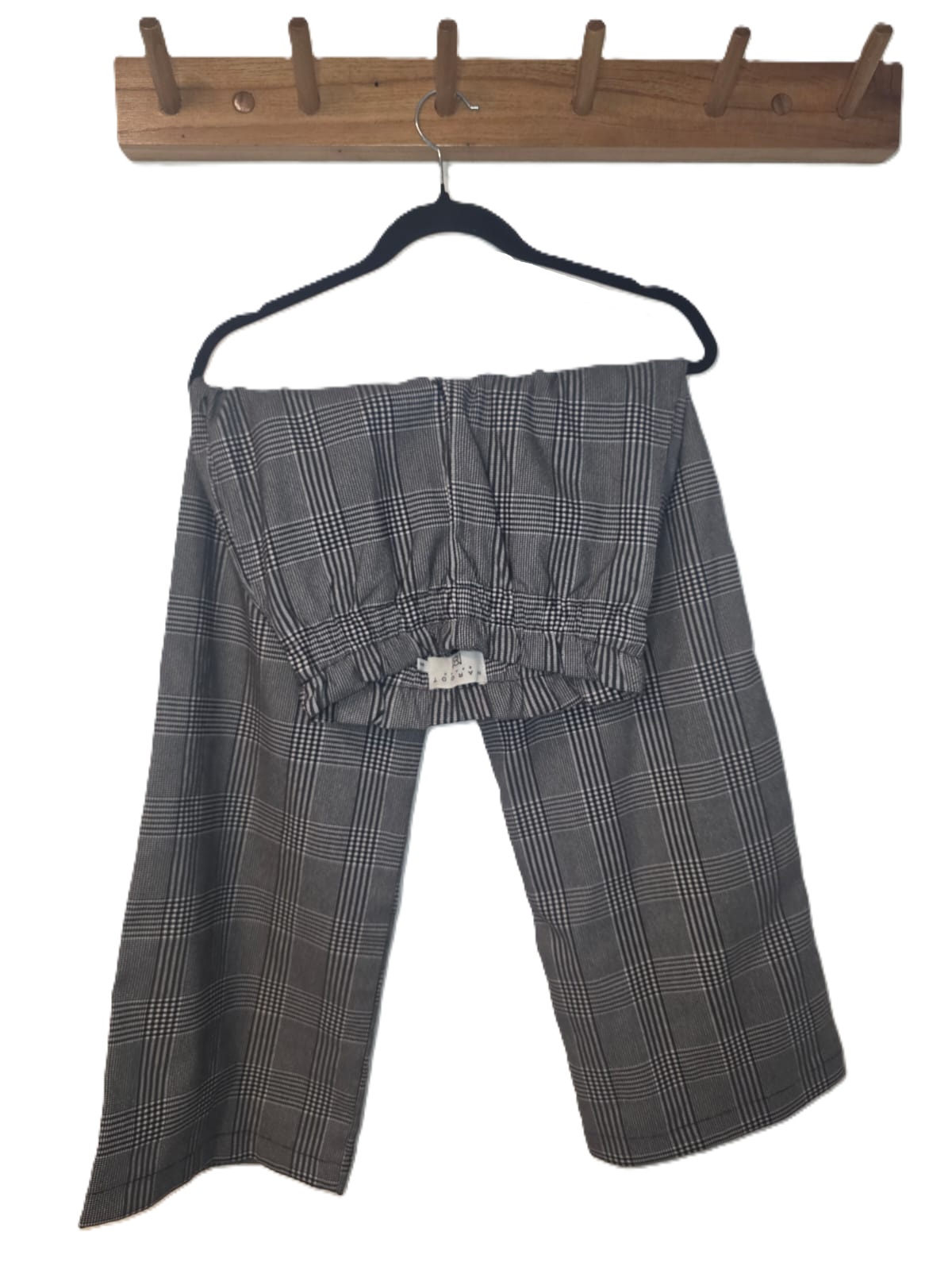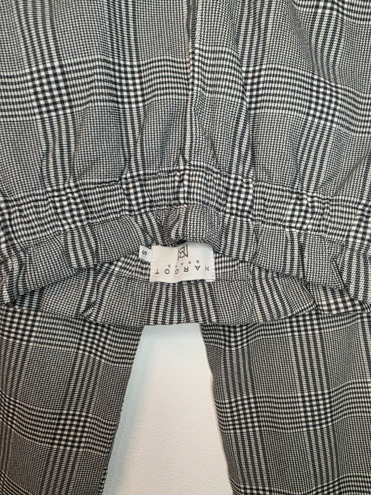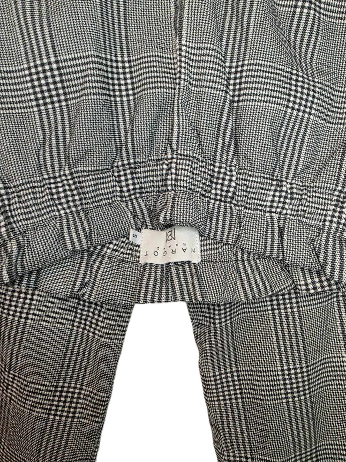 Pantalón de vestir usado marca Margot tiro alto con estampa príncipe de Gales en tonos gris y negro. De calce recto y caída suave, estiliza la figura y aporta un look elegante y moderno. La cintura es fruncida.