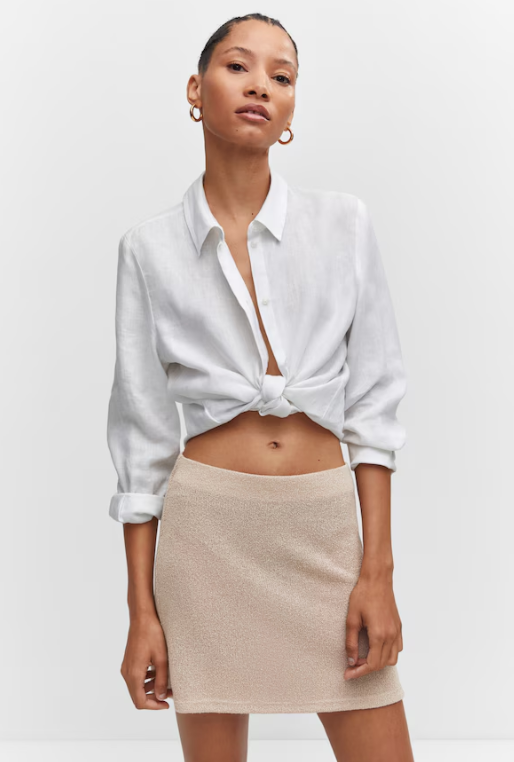 Pollera de punto marca MANGO beige nueva con etiqueta. Tejido de punto. Tejido semitransparente. Diseño entallado. Diseño corto. Tiro alto. Cintura elástica.