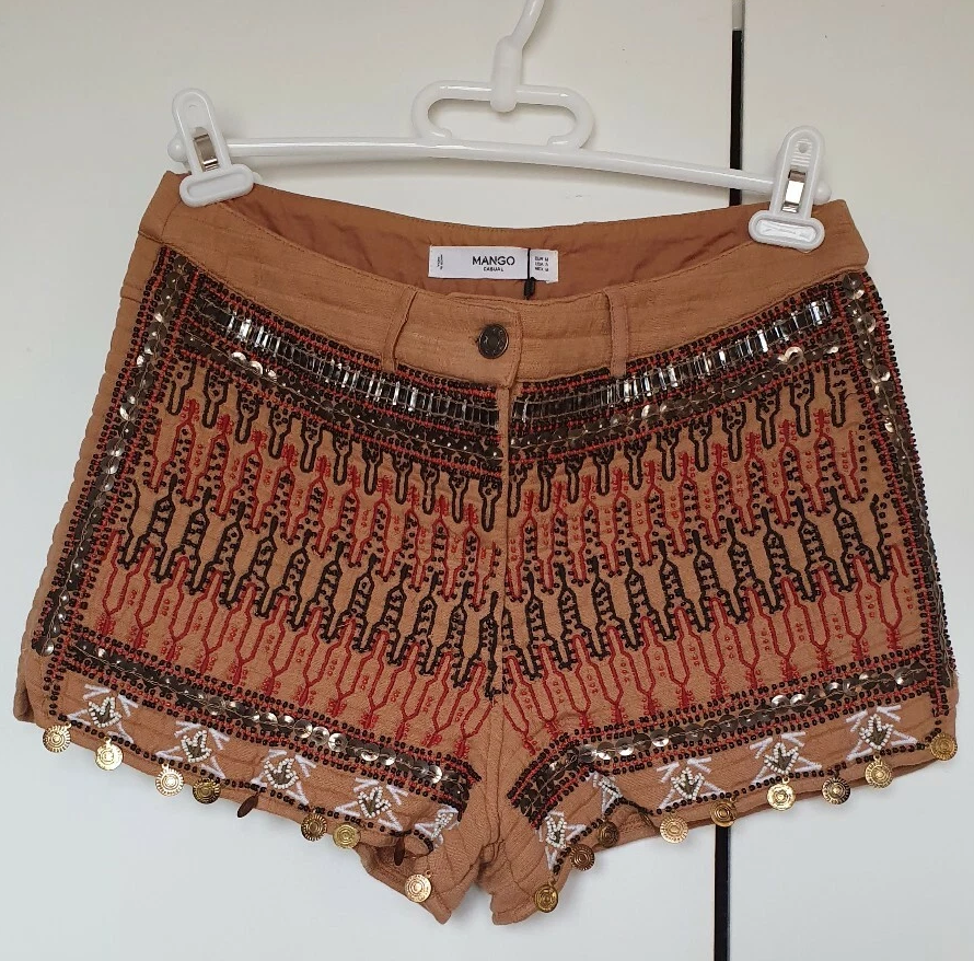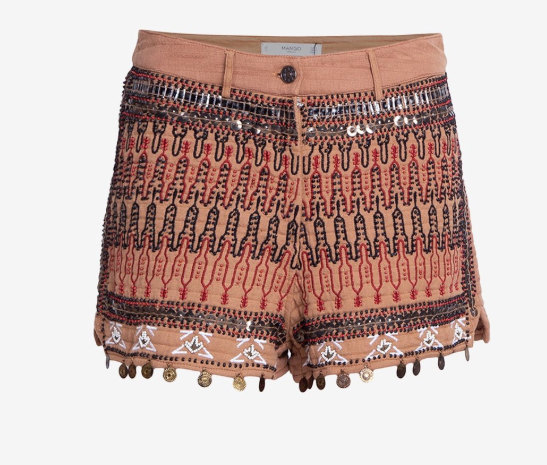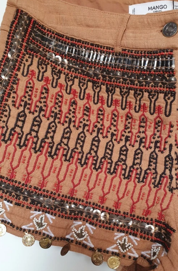 Short Mango nuevo, con un detalles. Confeccionado en tela liviana color camel, con bordados geométricos étnicos en tonos negro y rojo.