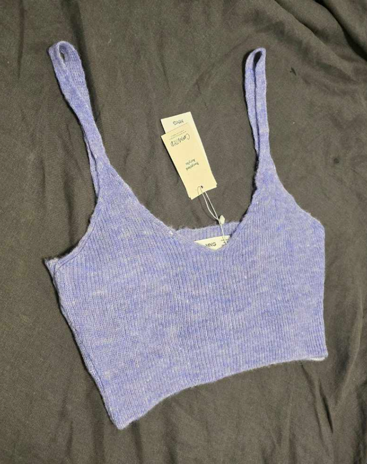 Top lila de MANGO nuevo con etiqueta. Tela con lana. Tejido de punto. Diseño recortado. Escote en V. Tiras finas.