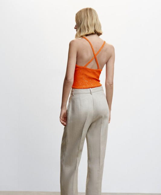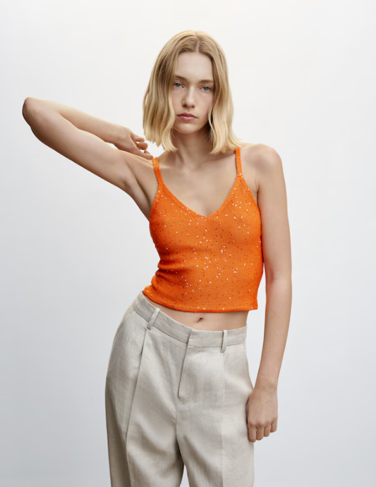 Top naranja con lentejuelas doradas marca Mango nuevo con etiqueta. Tejido de punto. Escote en V. Tiras finas.