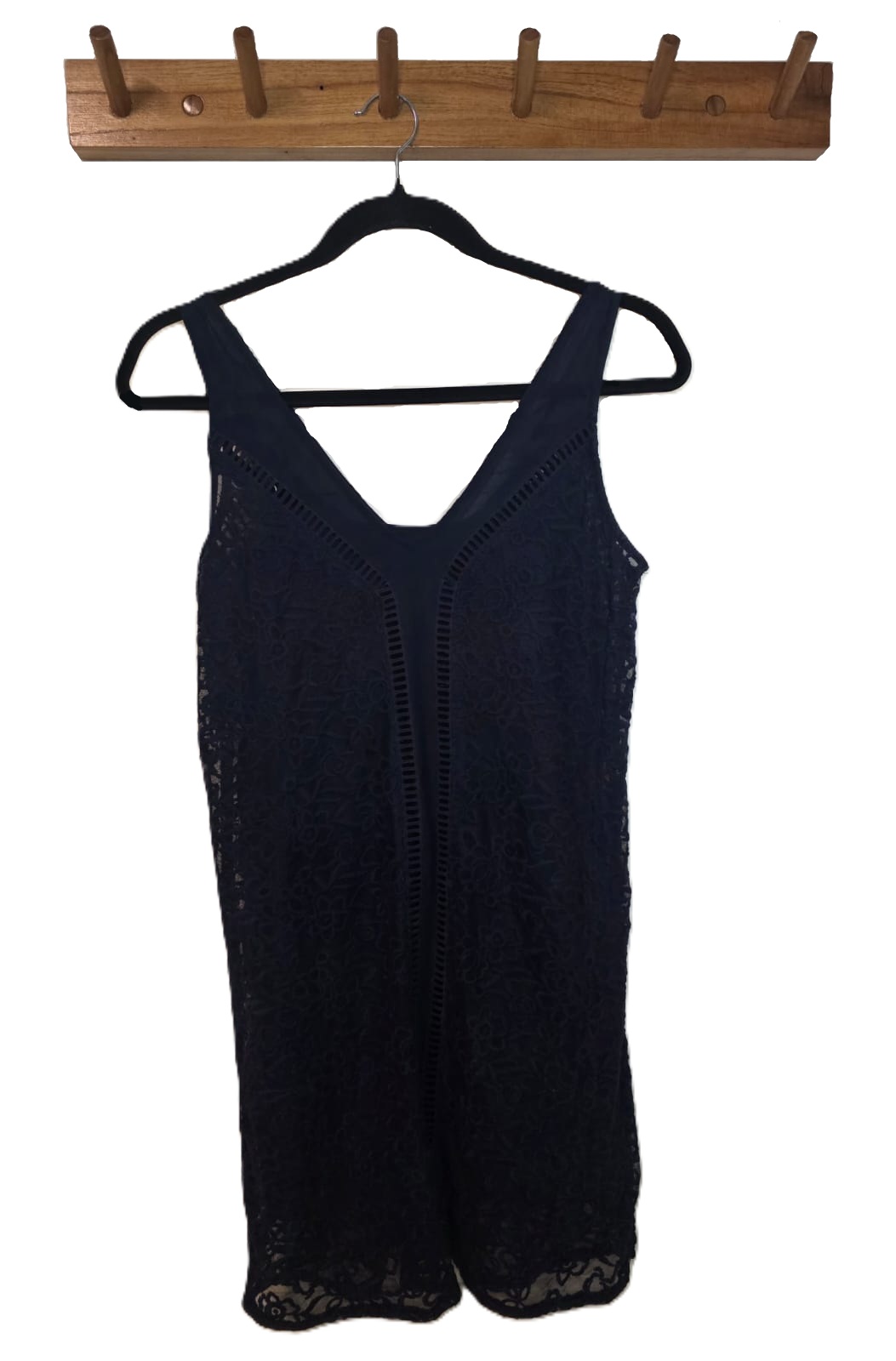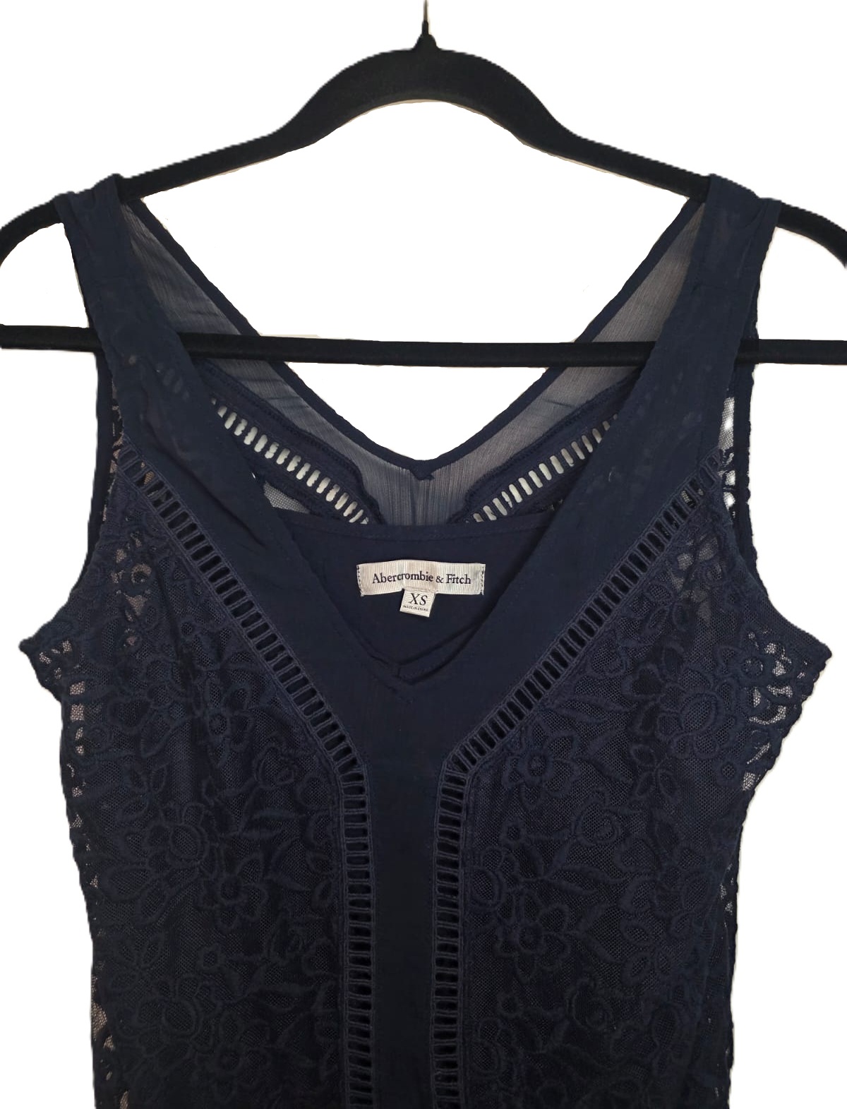 Vestido marca Abercrombie & Fitch como nuevo. Un elegante vestido corto de encaje azul noche con escote en «V» y detalles calados.