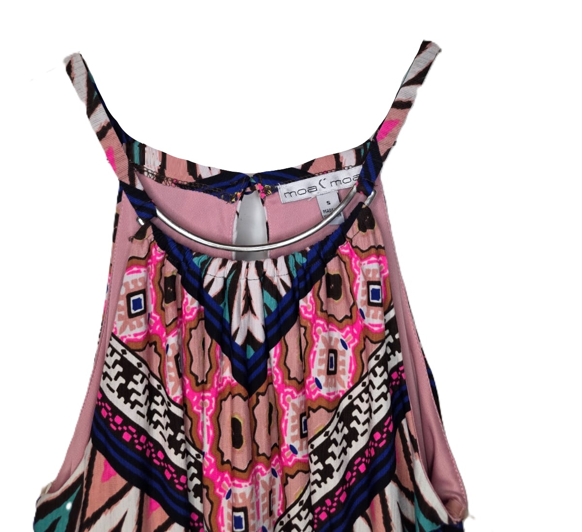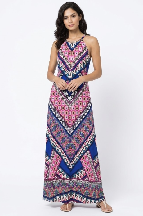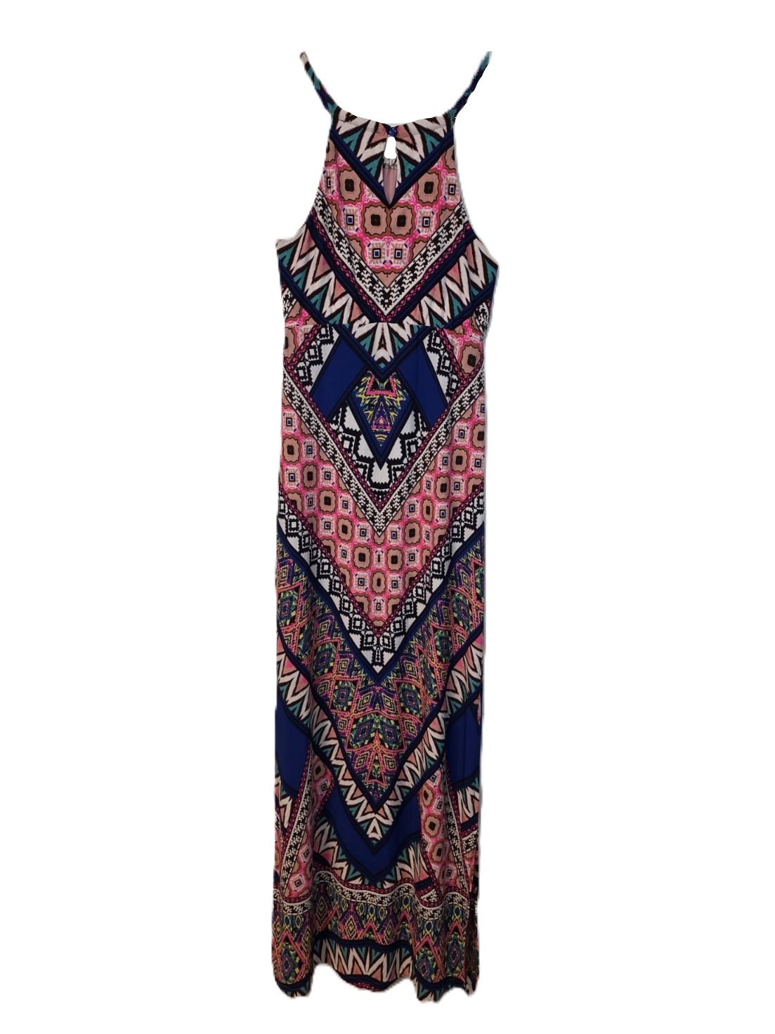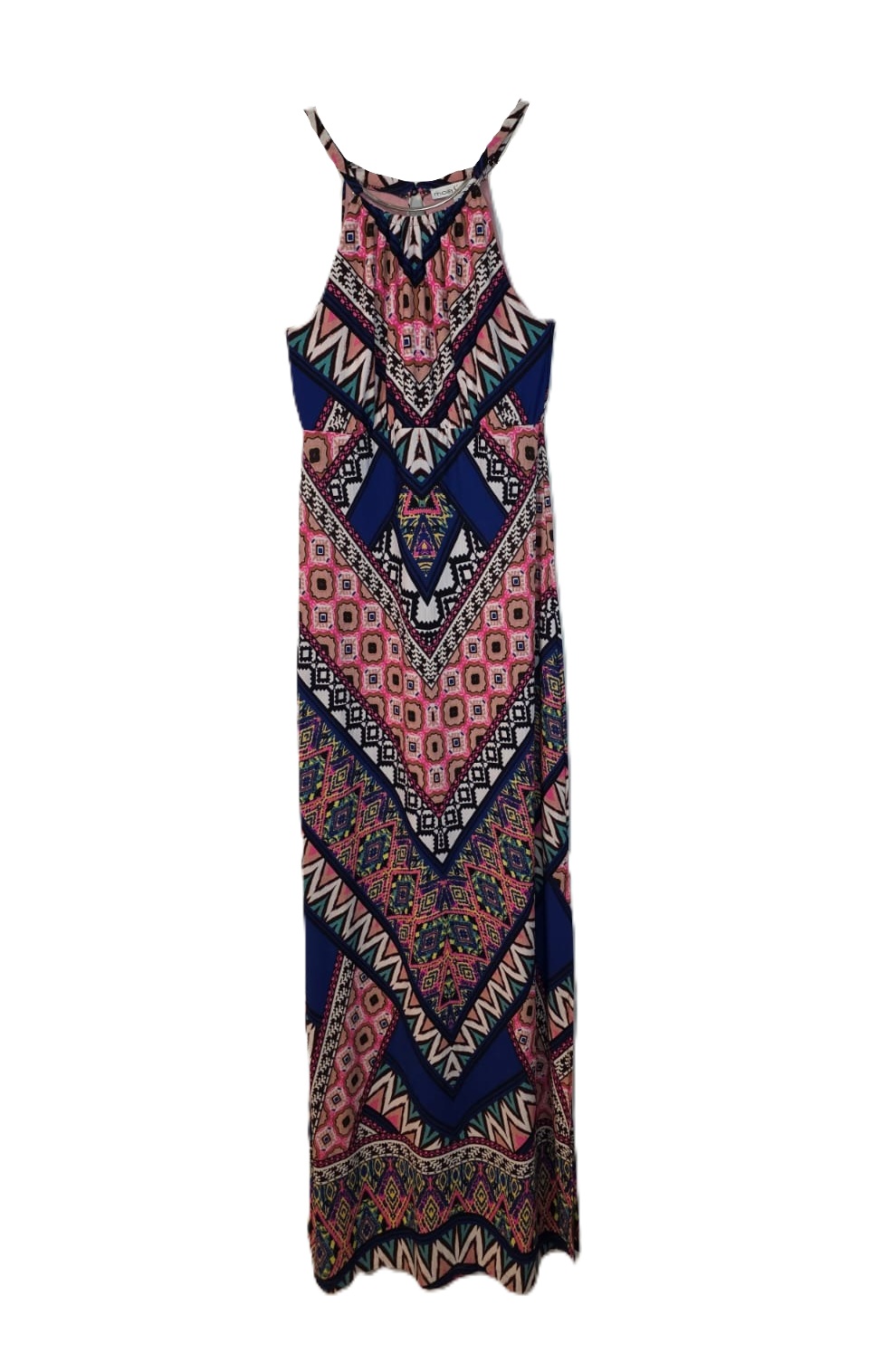 Vestido maxi de estilo boho-chic con cuello halter, detalle metálico y un vibrante estampado geométrico en tonos fucsia y azul, diseñado para estilizar la figura con una caída fluida y fresca. Nuevo sin etiqueta.