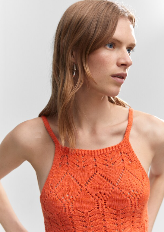 Vestido NUEVO con etiqueta. Tejido mezcla de algodón. Tejido de punto calado. Diseño entallado. Diseño corto. Cuello halter. Tirantes finos. Espalda con escote. Sin cierre.