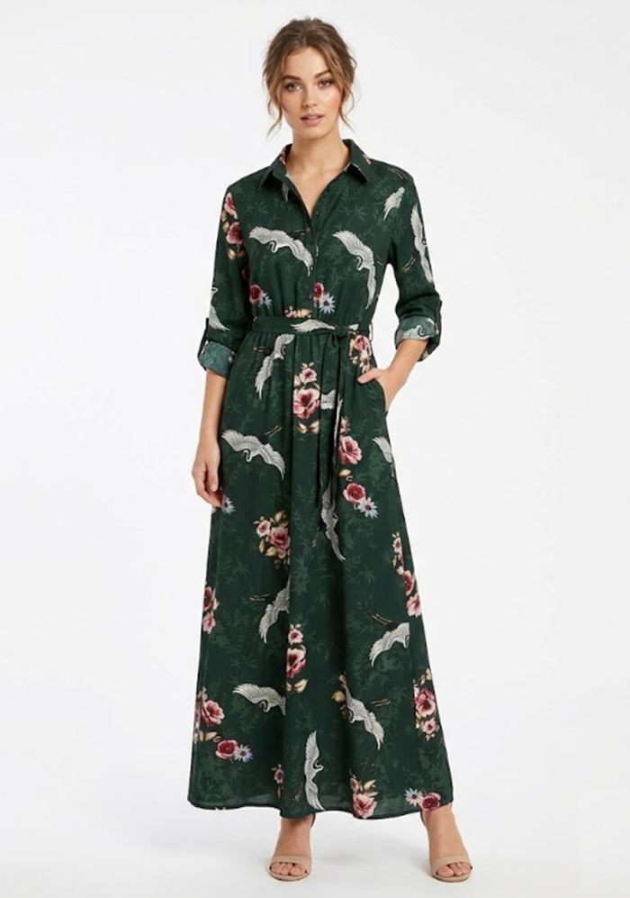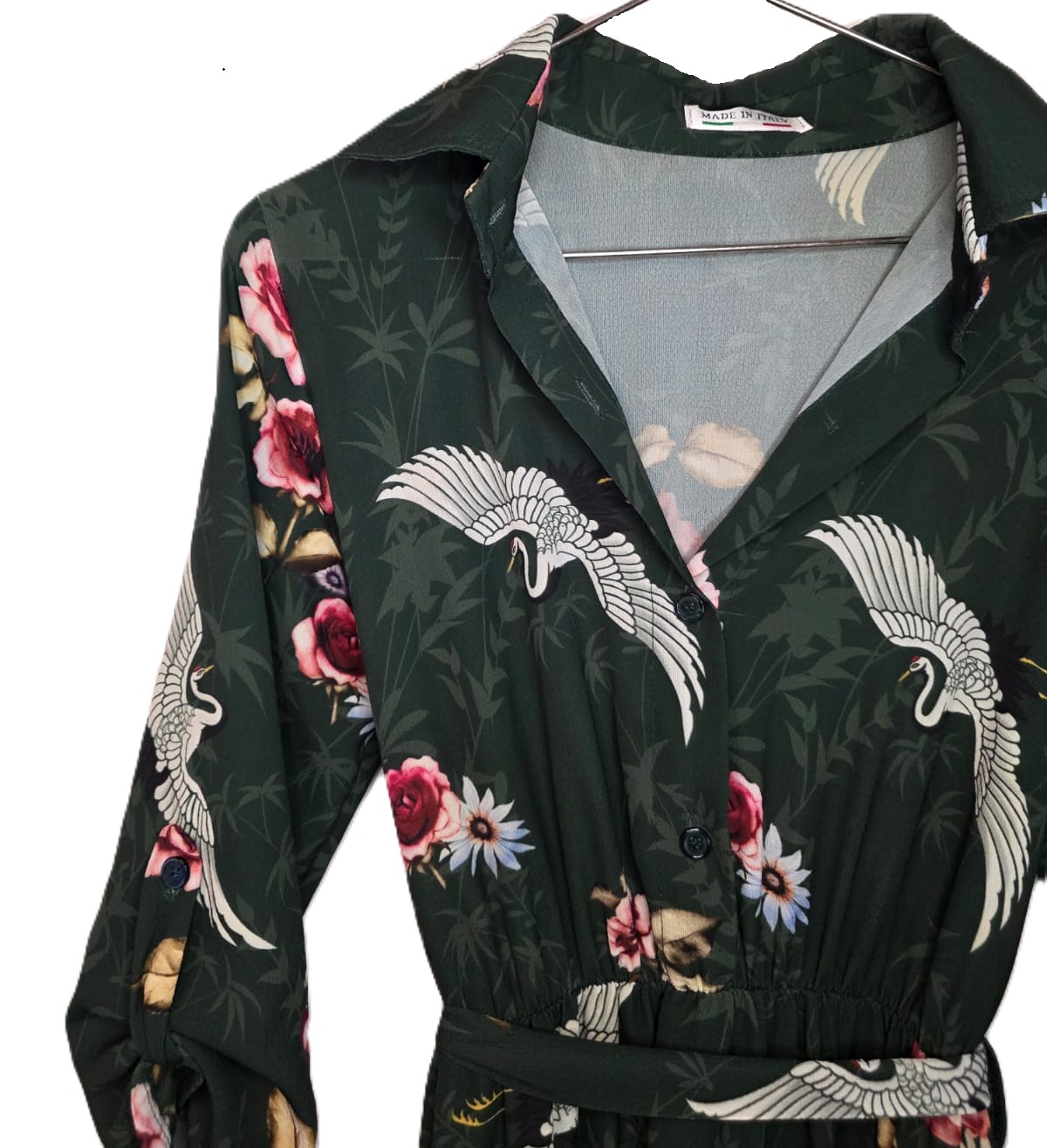 Vestido nuevo sin etiqueta importado de Italia, verde con dibujos de pájaros y flores.